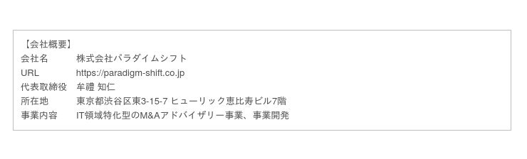 パラダイムシフトは、2011年の設立時よりIT領域に特化したM&Aアドバイザリー事業ならびに事業開発を手がけております。IT領域におけるM&Aの成約件数は、現在国内最大級の実績を有し、日本を代表する大企業からスタートアップ企業まで、多岐に渡るニーズに応えてまいりました。また事業開発においては、日々変化・多様化する社会の価値観や課題を先読みし、お客様のニーズに応える事業やサービスをワンストップで提供しております。