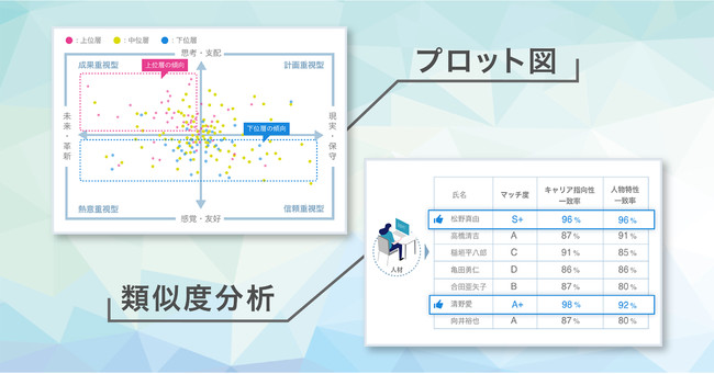 受検者の思考行動における特徴を算出し、全体の傾向をプロット図で表示します。上位層や早期離職者の分布や、応募者と従業員の類似度等が表されます。