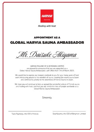 2023年より日本市場に本格的に上陸し、日本人のライフスタイルに併せた日本限定のアイテムを含めた14機種のサウナキャビンと13種類のサウナヒーターの展開を行います。本格上陸に併せてグローバル品質のHarviaが提供するフィンランドサウナの日本での普及や、グローバルに向けた日本発のサウナカルチャーの発信に期待を込めて日本のサウナ界を代表する「ととのえ親方」と「サウナ師匠」がグローバルアンバサダーを務めることになりました。3月7日にはHarvia CEO TAPIO PAJUHARJよりお二人に任命書の授与を行う授与式も実施しました。サウナヒーター、ストーブの市場において世界No.1のシェアを獲得しているハルビア社が、日本からグローバルアンバサダーを起用することは快挙と言えます。