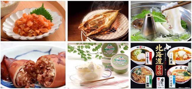 「鮭といくらの親子漬」180g+「羅臼産真ほっけ」約400g+「北海たこしゃぶ」約140g×1パック+「元祖森名物いかめし」2尾×1パック、「フローズンヨーグルト」5個+「北海道名店ラーメン」4食)をセットにしました。