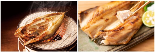 ◆羅臼産真ほっけ:世界自然遺産の町、知床羅臼で獲れた脂のりの良い特大の真ほっけを、羅臼昆布出汁の効いた塩水に漬けてひと手間かけて仕上げました。