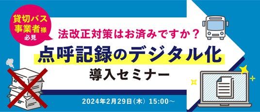【2月29日開催】貸切バス事業者様必見!法改正対策はお済みですか?点呼記録のデジタル化導入セミナー