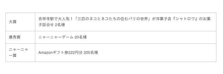 応募者の中から素敵な作品に吉祥寺駅で大人気の猫をモチーフとした『シャトロワ』のお菓子や、ニャーニャーゲームなどを、合計222名様にプレゼント♪