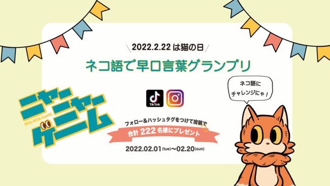 ニャーニャーゲームや、ニャーメンズなどのネコを題材にしたボードゲームの企画開発をてがける株式会社MAGI(所在地:東京都武蔵野市、代表取締役:大宮光晶)は、2022年2月22日の猫の日を記念して、合計222名様に猫にちなんだ商品が当たる「ネコ語で早口言葉グランプリ」をInstagramとTikTokで開催しますにゃ。