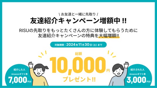 RISU算数・RISUきっずをお友達にご紹介いただいた場合、「ご紹介様」「お申込みいただいた方」双方にアマゾンギフト券をプレゼントする制度となっております。
