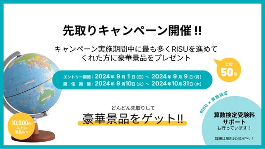 キャンペーン実施期間中に最も多くRISU算数・RISUきっずを多く進めてくれた方に豪華景品をプレゼント予定です。