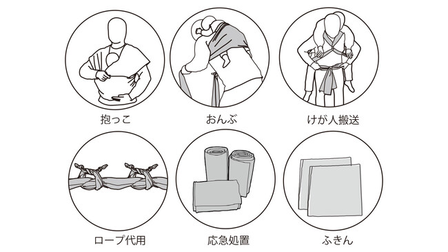 おんぶや抱っこは親子の素晴らしいコミュニケーションの方法であり、また1本の帯は日常生活からいざという時の備えまで様々な用途があります。例えばけが人を背負って搬送したり、ロープの代用として使ったり、止血や応急処置の道具としても活用できます。