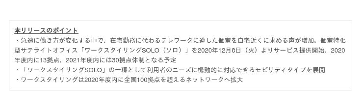 新型コロナウイルス感染症(COVID-19)の感染拡大を契機とし、在宅勤務が増加するとともにその課題も明らかになってきました。自宅の近くでテレワークに集中できる環境の整備を望む声が高まり、「ワークスタイリングSHARE」では、WEB会議などに対応できる1人用個室のニーズが増加しています。また、会員の皆様からは、自宅の近くで利用したいという声が多くあがっています。ワークスタイリングはこれらのニーズを捉え、新たに郊外エリアを中心とした個室特化型サテライトオフィス「ワークスタイリングSOLO」の提供を12月より開始する運びとなりました。