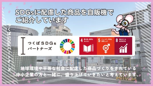 設置場所のつくば駅前つくばセンター広場(ノバホール前)で、自動販売機を活用したテストマーケティングを実施しています。茨城県を中心とした中小企業の新しいSDGs配慮商品を自販機で販売。各商品にQRコードを貼り、お客様アンケートを実施、毎月1名様にSDGs配慮商品をプレゼントいたします。中小企業の皆さんの素晴らしい商品をたくさんの方に知っていただく機会に努めてまいります。