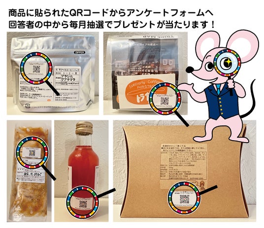 各商品にはテストマーケティング用のQRコードを貼り付けており、お客さまのアンケートをもとに中小企業の方々が商品開発に活かせる仕組みです。アンケートにお答えいただくと毎月1回抽選でプレゼントが当たります!