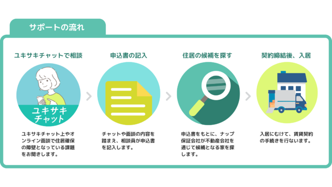 ユキサキチャットを通じて相談者の課題や経済状況を事前にヒアリングすることで入居審査にかかる工程を削減。スムーズな住居確保につなげます。