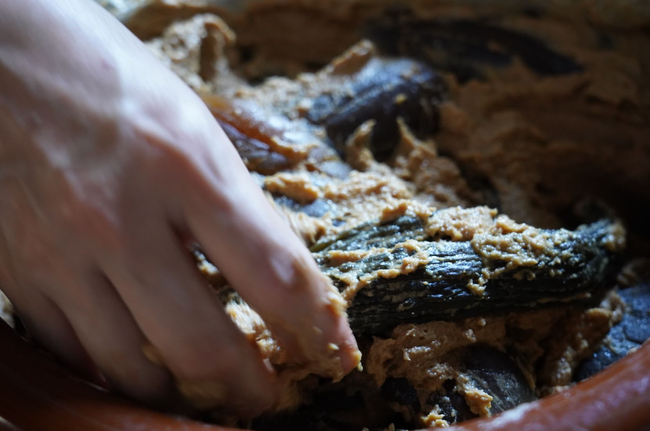 地元に昔からある酒蔵「冨田酒造」の酒粕と「山路酒造」のみりん粕を使用して、1年ごとに漬け直し、2年間発酵させて作るという特徴がある。一般に使うザラメではなく、みりん粕を使う点もポイント。