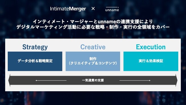 マーケティングの側面から事業成長を支援する株式会社unnname(本社:東京都渋谷区、代表取締役:宮脇 啓輔、以下「unname」)は、国内最大級のパブリック DMP を提供するデータプラットフォームカンパニー、株式会社インティメート・マージャー(本社:東京都港区、代表取締役社長:簗島 亮次、以下「インティメート・マージャー」)と業務連携を行い、戦略構築・データ分析・施策実行までを一気通貫でご支援する「統合型デジタルマーケティング支援」の提供を開始します。
