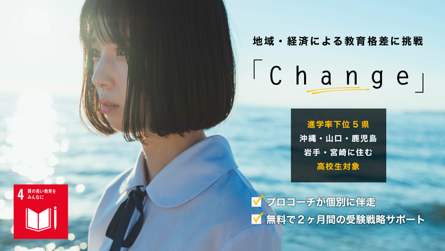 当社では、現在、大学受験の情報格差・教育格差の解消のため、オンラインでの受験サービスの提供を行っています。また、公教育支援として地方自治体や高校にて無料講演を行うほか、今春から高校内で大学受験の支援を行う「AXIV for school」を本格的に開始。こうした取り組みを通して、多くの高校生や保護者、教師と話す中で「参考書が買えない」「学校に通えない」「勉強する目的がわからない」「受験科目が授業にない」といった経済・地域・情報の格差を体感してきました。そこでこの度、SDGs の目標にもなっている「質の高い教育をみんなに」に関連する現在の取り組みを強化すべく、2か月間のプロ講師による大学戦略支援の無料支援「Change」を開始することにいたしました。