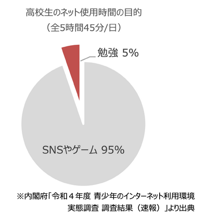 内閣府の調査によると高校生のインターネット使用時間は5時間45分/日。そのうち勉強時間は57.8分、平均4時間45分以上SNSやゲームに時間を費やしています。当社では、このスマホ時間をいかに減らして、“スマホ体質”を“学習体質”に変えるかが受験において重要だと考えており、学習習慣やスマホ時間の可視化などを行っています。