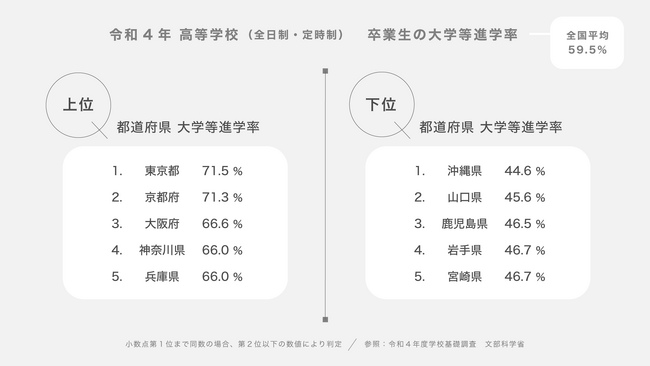 経済や地域による教育格差、教職員の労働問題など、現在の日本でも教育において取り組むべき課題があります。文部科学省の令和4年度学校基礎調査によると、短大・四年生大学その他の進学率は過去最高を記録。都道府県別を見てみると、大学等の進学率は26.9%もの差があることが分かります。当社は人口6万人未満の愛知県田原市に本社を置き、都市にも地方にも教室を展開する中で、大学受験そのものの情報に限らず、職業や受験のロールモデルが身近に少ないことも、高校生の情報格差に影響を与えており、都市と地方のこの高校生の環境差が、大学進学率が異なる要因の一つであると捉えています。