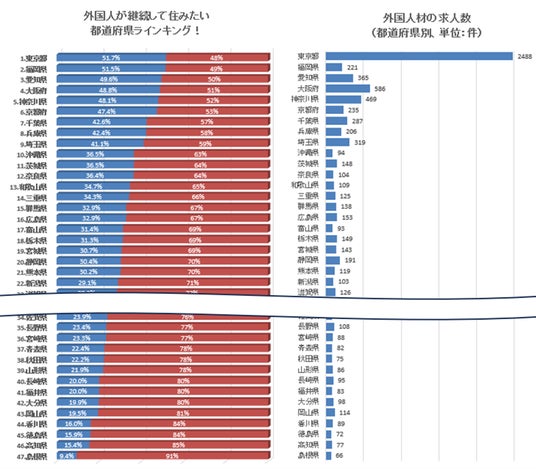 日本語ビジネスレベル以上の外国人材が登録をする、外国人のための就職・転職情報サイトNINJA(以下「NINJA」)を運営する 株式会社グローバルパワー(本社:東京都台東区 代表取締役社長 竹内 幸一)は、「外国人が継続して住みたい!」と考える都道府県の調査を行いましたので、発表致します。