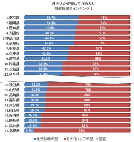 特筆すべきは福岡県で、上位ランクの中でも外国人対象の求人数は少なく、大学設置数も5位にも関わらず、継続して住みたいランキングでは東京都に次いで2位となっています。