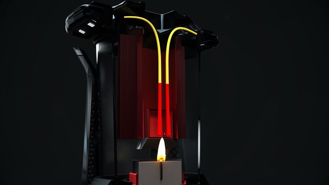 その仕組みは、熱電発電機構を利用したものです。通常、オイルランプはそのエネルギーのほとんどを熱として放出してしまい、光として発散するのはごくわずか。