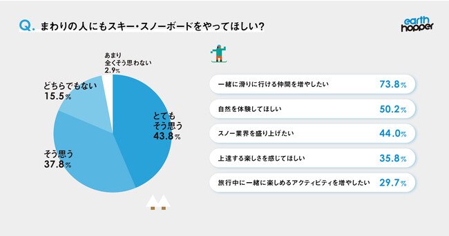 家族や友人など周りの人にもスキー・スノーボードをやってほしいか聞くと、「とてもそう思う」43.8%、「そう思う」37.8%と、実に全体の8割を超えるスキーヤー・スノーボーダーが普及活動に前向きなようでした。そう答えた理由としては、「一緒に滑りに行ける仲間を増やしたい」が73.8%と、本人たちの身近なところに動機があることがうかがえます。選択肢として用意した「スノー業界を盛り上げたい」に44.0%、「スキー場の経営に貢献したい」に36.7%も回答が集まり、自由記述欄にも「ゲレンデ離れ」を嘆く声が上がるなど、業界のことを考える傾向が強く見られました。