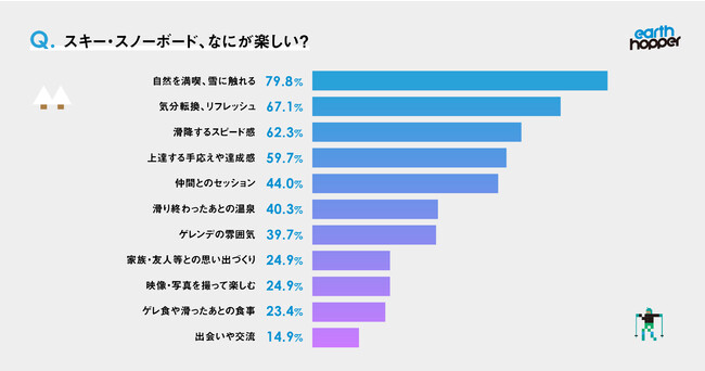 何が楽しくてスキー・スノーボードをしている?という質問には、「自然を満喫、雪に触れる」が79.8%と最も多く、「気分転換、リフレッシュ」が67.1%、「上達する手応えや達成感」が59.7%となりました。自由記述欄には「現実逃避」「非日常感」「非現実的な景色」「パウダースノーを滑るときの浮遊感」といった回答が見られ、日々の生活から離れ大自然の中に身を置くことを楽しんでいるようです。