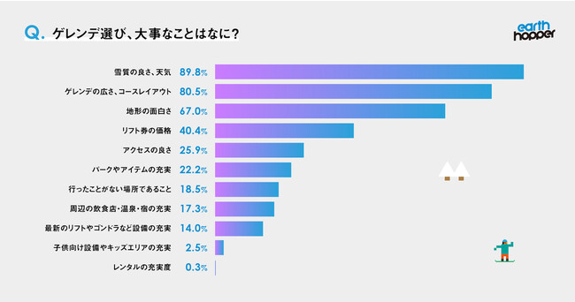 行き先のゲレンデを選ぶとき何を重視する?(複数回答)という質問には、「雪質の良さ、天気」が89.8%と最も多く、「ゲレンデの広さ、コースレイアウト」が80.5%、「地形の面白さ」が67.0%となりました。「最新のリフトやゴンドラ」「周辺施設の飲食店・温泉等の充実」「パークやアイテムの充実」といった設備面を選ぶ人は各25%以下と多くなく、本調査の回答者は「ゲレンデの状態や雪・天気のコンディション」を重視していることがうかがえました。自由記述欄には「混雑していないこと」を重視する回答も多く、この結果からも都会や人工的空間と対極にある「自然体験」を求めていると考えられます。