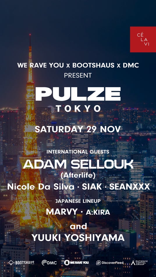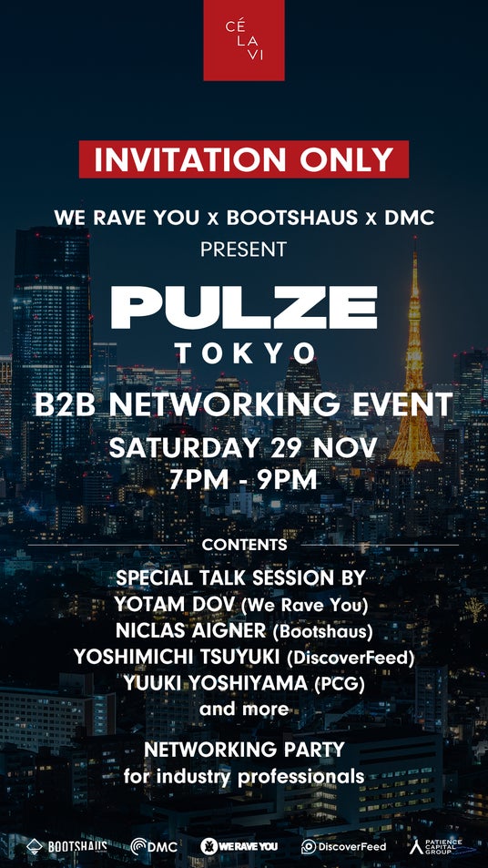 2025年11月29日(土)、CE LA VI TOKYO(東京都渋谷区)にて大手グローバルミュージックメディア「We Rave You」、ドイツTOPナイトクラブ「Bootshaus」、ブロックチェーンサービス「DMC」による新規グローバルイベント「PULZE TOKYO」を開催いたしました。