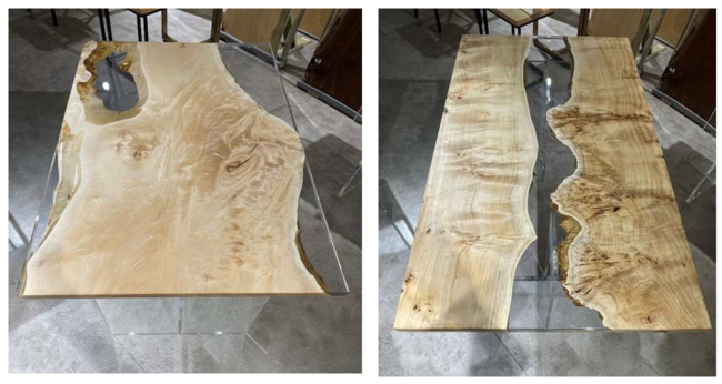 左:栃レジンデスク( 1070×630×50mm ) 右:栃リバーテーブル( 900×550×35mm )