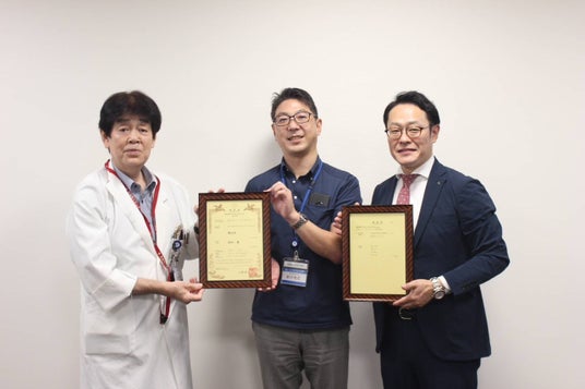 特許証を持つメンバー(左から、横浜市立市民病院 病院長 中澤様、岡本様、当社(株)エーディエフ代表島本)
