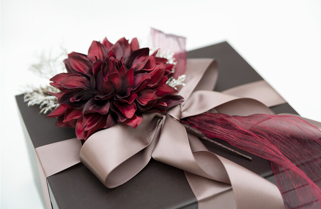 花束に使用しているのは艶やかな造花やプリザーブドリーフなので、ギフトを渡す日に合わせる必要がなく、事前に用意しておけることも、好評の要因になっています。