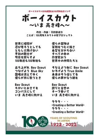 ボーイスカウトの活動において、楽しさや喜びを仲間と共有・共感するため、また、スカウト精神に触れることができる身近なツールとして、「歌」は欠かせないものです。100周年を機に、加盟員およびその保護者から、歌詞につながる「ことば」を募集し、それをもとに作詞作曲を弓削田健介氏に依頼しました。ボーイスカウトの楽しさや魅力、そしてどんな大人になりたいか、どんな社会にしたいかという「夢」をこめた歌です。