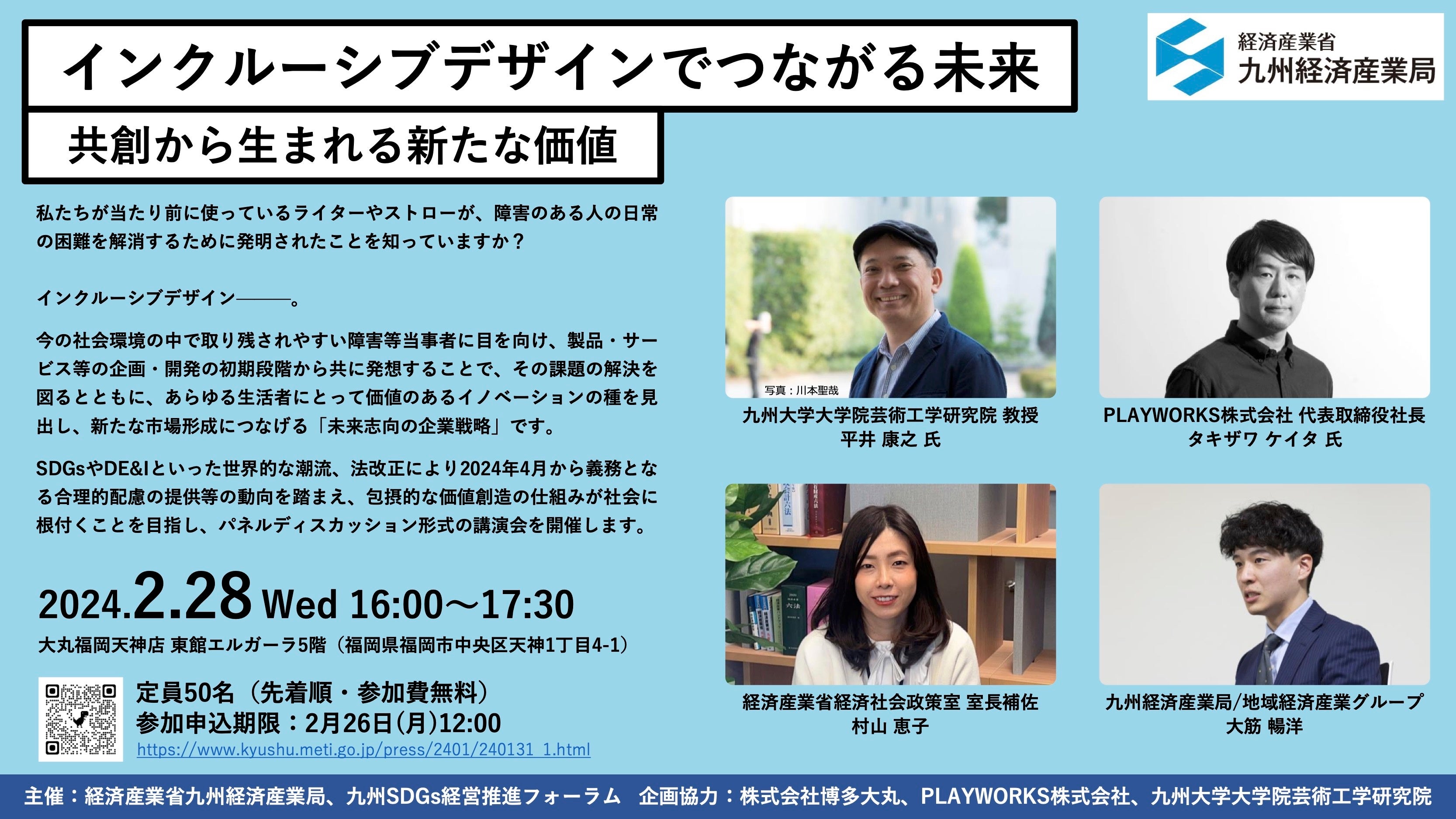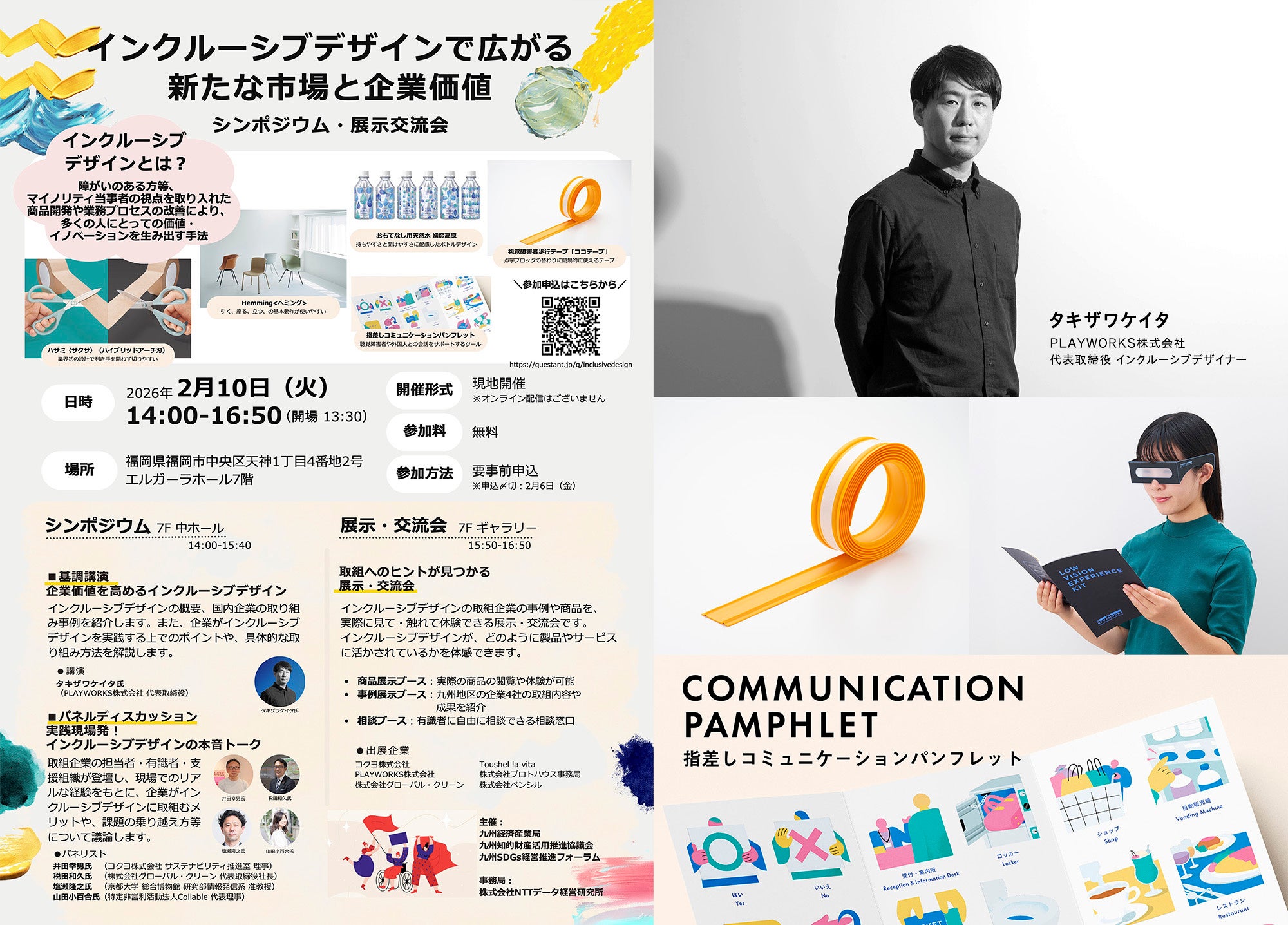 インクルーシブデザイン・コンサルティングファーム PLAYWORKS株式会社(本社:東京都目黒区 代表取締役:タキザワケイタ)は、九州経済産業局、九州知的財産活用推進協議会、九州SDGs経営推進フォーラムが主催するシンポジウム・展示交流会 「インクルーシブデザインで広がる新たな市場と企業価値」(2026年2月10日、福岡市)において、代表取締役 タキザワケイタが基調講演に登壇することをお知らせします。