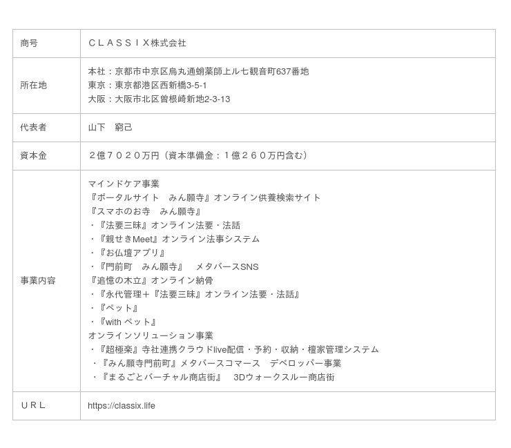CLASSIX株式会社(本社:京都府京都市中京区、代表取締役:山下窮己、以下「当社」)は多死化社会に備え、お寺納骨「追憶の木立」を提供してまいりました。この度、寺院のご協力を得てマインドケアプラットフォームを展開し、ご供養の新しいかたちスマホのお寺「みん願寺(みんがんじ)」の提供を開始します。第1弾としてオンライン法要のサブスクリプション「法要三昧(ほうようざんまい)」を開始いたします。