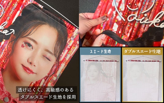 ケイオーのオリジナル タペストリーには、手触りが良く贅沢な触り心地のダブルスエード生地を採用しています。通常のスエード生地に比べて生地に厚みがあり、遮光性が高いため透けにくく、高級感のあるマットな質感が特徴です。光沢感が適度に抑えられているため、上品で落ち着いた仕上がりのオリジナル タペストリーを制作することができます。
