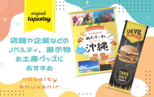 オリジナル タペストリーは、観光名所や地域のご当地キャラクターをデザインして制作することで、名所グッズや観光地のお土産として人気のアイテムに仕上がります。また、タペストリーは実用性も高いアイテムですので、ショップや企業のノベルティグッズやセミナー会場や店舗等の「のぼり」やブース装飾品、備品としても最適です。