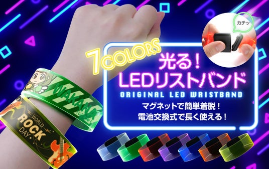 ▼ 光るLEDリストバンドマグネットで簡単に着脱できる、電池式の光るLEDリストバンドです。ケイオーのオリジナル光るLEDリストバンドは全7色をご用意しておりますので、メンバーカラーに合わせて推しメン別に制作する「推し活」グッズとしても最適です。カラフルに光りますのでSNS映えも抜群です!