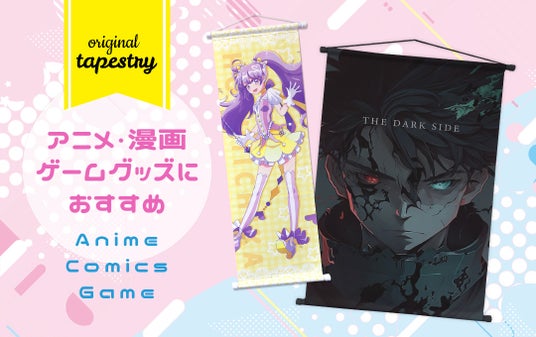 オリジナル タペストリーは、アニメグッズ、漫画グッズ、ゲームグッズなどのキャラクターグッズとして最適なアイテムです。お気に入りのキャラクターや作品のロゴをプリントして、「推し活」グッズや、多くのファンに喜ばれるグッズとして制作いただけます。アニメやゲームの世界観を表現するカラフルなデザインのイラストが映える、インパクトのあるグッズ制作が可能です。