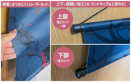 ケイオーのオリジナル タペストリーは生地の側面をレーザーカットにて加工していますので、ほつれにくく耐久性が高いのが特徴です。タペストリーの上下(ガーランドタイプは上部のみ)は袋縫い加工され、塩ビ(PVC)製のパイプが通るようになっています。パイプは切りっぱなしではなく、両端にキャップが付く仕様です。非常に軽量で持ち運びも簡単。エンドユーザー様は組み立ての手間もなく、すぐに飾って楽しむことができます。