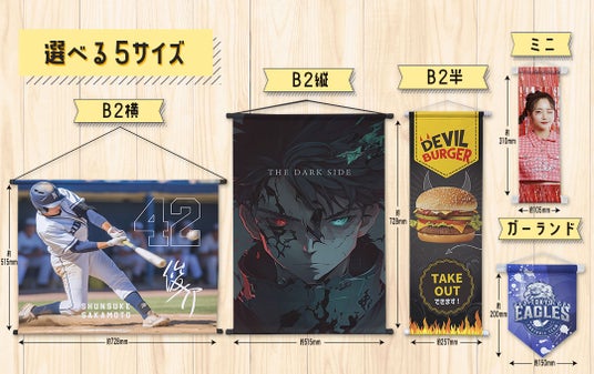 ケイオーのオリジナル タペストリーは5種類のサイズをご用意しております。人気の高いB2縦(約728×515mm)・B2横(約515×728mm)の大きなサイズから、細長くキャラクターやアーティストなどの全身を入れやすいB2半(約728mm×257mm)、コンパクトなミニタイプ(約310×105mm)、旗のような形状のガーランドタイプ(約200×150mm)があり、デザインや用途にあわせてお選びいただけます。