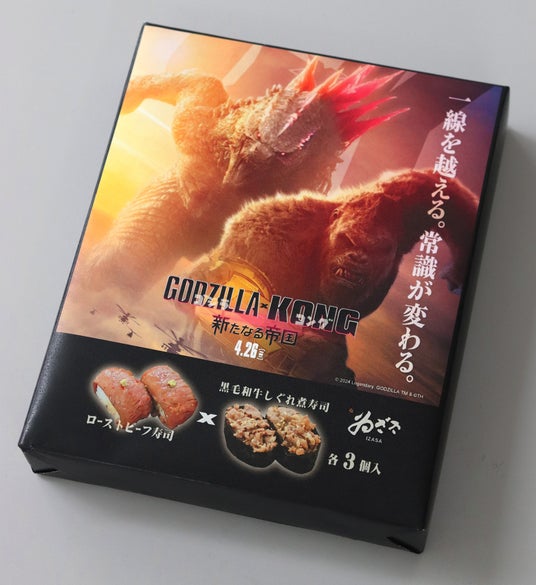 包装紙は映画公開に合わせ、ゴジラとコングのビジュアルをメインにした特別パッケージ。低温調理で柔らかく 仕上げたローストビーフに、香味野菜などを使ったタレを和えた「ローストビーフ寿司」と、黒毛和牛を甘辛く 炊いた「しぐれ煮」を使った「黒毛和牛しぐれ煮寿司」が各 3 個入った詰合せ。添付のワサビをローストビーフ に付けて、味変も楽しめます。