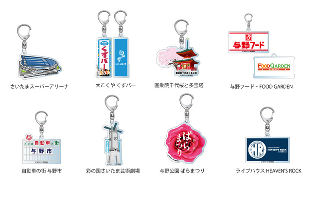 今回のラインナップは、海外トップアーティストの公演も行われる日本を代表する多目的アリーナ「さいたまスーパーアリーナ」、とけないアイス「くずバー」が大人気の老舗和菓子店「大こくや」、鎌倉時代から続く由緒ある寺院「圓乘院(えんじょういん)」の「千代桜と多宝塔」、長年地元民の食を支え続けているスーパーマーケット「与野フード・FOOD GARDEN」、かつては関東のデトロイトと言われるほど自動車産業で栄えた与野を象徴する「自動車の街 与野市」の大型サイン、優れた舞台芸術を埼玉から世界に発信する「彩の国さいたま芸術劇場」、約180種類3,000株のバラが咲く与野公園で毎年5月中旬に行われる「ばらまつり」、大人気ライブハウス「HEAVEN'S ROCK(ヘブンズロック)VJ-3」の全8種類。