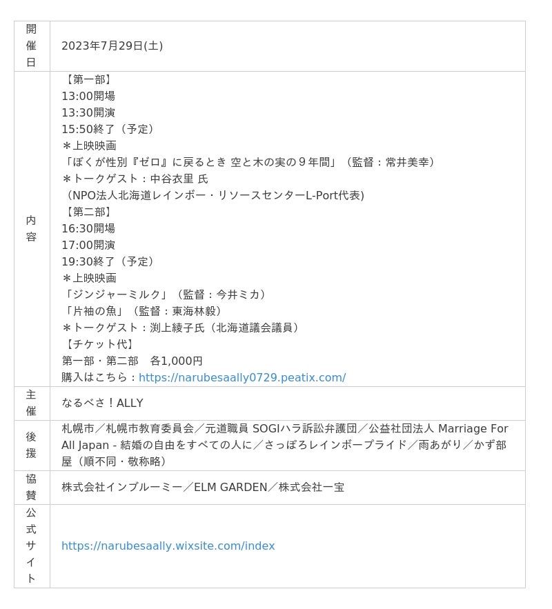 このたび、札幌市が後援するLGBTについて理解を深める映画祭の開催にあたり、開催目的に共感いたしましたので、協賛させていただくこととなりました。互いの個性や多様性を認め合い、誰もが生きがいと誇りを持つことが出来るまちの実現を目指します。