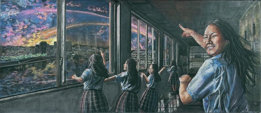夕暮れに窓の外をみると、複数の流星が群となり鮮やかな放物線を描き輝いています。その一瞬の輝きや流れる様子に、自らの高校生活を重ね合わせ、「流星も群になれば雲さえも貫く強い光となり、一人では出せない力も合わさればすべてを突き抜ける力になる」という意味を込めたそうです。高校生がチャレンジしていく未来への希望を強く感じさせ、今という一瞬を生きるかけがえのない時間と思いを色鮮やかに描き出しています。重なりあった窓の描き方にもこだわりを感じる作品です。