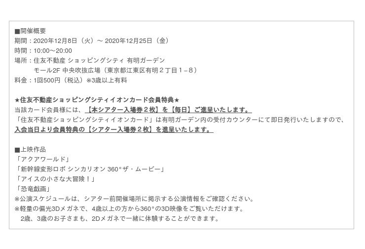 住友不動産商業マネジメント株式会社(東京都新宿区、代表取締役社長 津村健二)が運営する「住友不動産 ショッピングシティ 有明ガーデン」は、株式会社ピー・ビーシステムズ(福岡県福岡市、代表取締役社長 冨田和久)と提携し、360°全周囲に投影された立体映像による特殊シアター「4DOH(フォーディーオー)」を、「ARIAKE GARDEN CHRISTMAS」のメインイベントとして開設することをお知らせいたします。