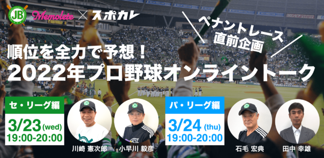 アスリートからあなただけに、オリジナルの体験を届けるサービス「Memolete」を運営するAthReebo株式会社(本社:東京都世田谷区、代表取締役:金沢景敏)は、プロ野球OBが約1,300人所属している日本プロ野球OBクラブ(公益社団法人全国野球振興会)、試合観戦情報アプリ「スポカレ」を運営する株式会社スポカレ(本社:東京都港区、代表取締役:荒木重雄)と共同で、2022年3月23日(水)、24日(木)にオンライントークイベントを開催します。