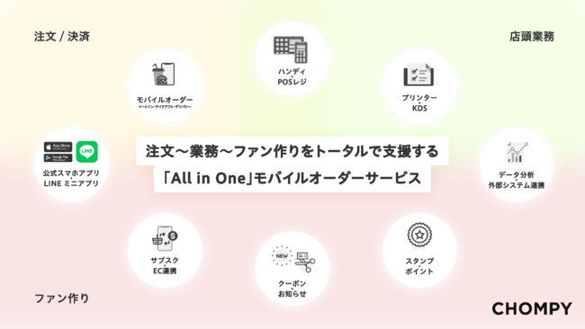 Chompyは、あらゆるUI・あらゆる注文方式に対応でき、業務効率化だけでなく顧客体験の向上・ファン作りも同時に実現できる「All in One」な公式ストアフロントです。今まで複数のデジタルツールに分断されていた顧客体験/データや業務を一元管理していくことで、飲食小売ブランドの店頭の顧客体験・業務のデジタル化と、ブランドの魅力がより多くの人に届くサポートをします。
