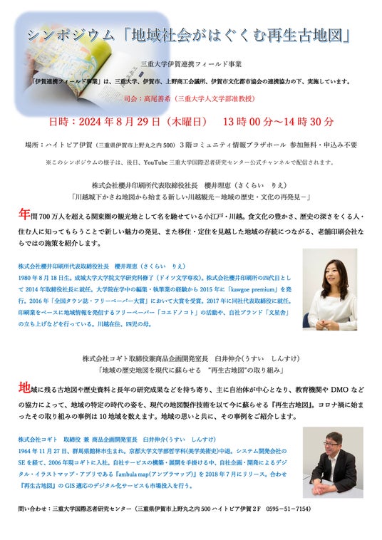 株式会社コギト(本社:京都府京都市、代表:太田 稔)は、2024年8月29日(木)13:00~14:30に開催される、三重大学国際忍者研究センター主催のシンポジウム「地域社会がはぐくむ再生古地図」に、取締役 臼井伸介が登壇することをお知らせいたします。