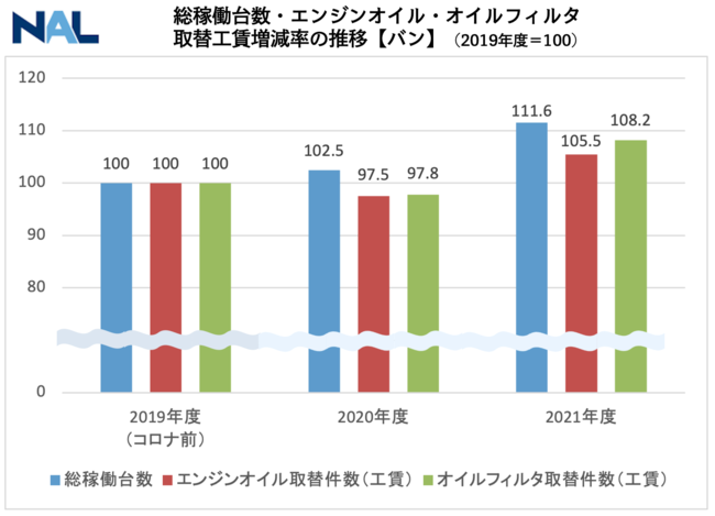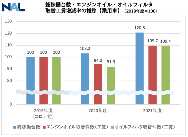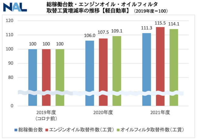 点検・整備費用の細目を分析したところ、多くの項目で整備件数および費用(工賃+部品)が増加していたものの、新型コロナウィルス感染症が流行し始めた2020年度については、消耗品の代表格であるエンジンオイルおよびオイルフィルタの点検・整備費用が、「軽自動車」を除いて減少していることが判明しました。各車種における増減の度合いを示したグラフが図2~図5です。なお、2021年度に入ってからは減少に歯止めがかかり、点検・整備費用は増加に転じています。