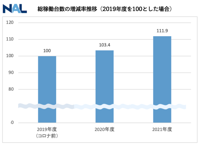 ナルネットコミュニケーションズが管理するリース車両の台数は年を追うごとに増えており、月ごとの稼働台数(当社にてメンテナンス受託している車両数)を集計した年間稼働台数も約67万台(2019年度)から約69万台(2020年度)、そして約75万台(2021年度)へ約12%増加しています。年間稼働台数の増加率の推移をグラフで表したものが図1です。なお、この間に日本の新車販売台数は15%程度減少していることと比較すれば、当社自動車メンテナンス受託事業は堅調と言えます。