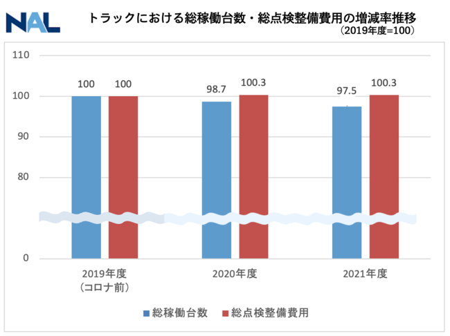 総稼働台数は減少しているにもかかわらず、新型コロナウィルス感染症の流行が始まった2020年度以降、点検・整備費用は増加しています。いわゆる「巣ごもり需要」でインターネット通販等の宅配荷物が急増したことにより、トラック輸送のニーズが増加。国土交通省の調査(※)では、2021年度のトラック輸送トン数は2019年度に比べ3.7%増加、宅配便貨物個数は13.8%増加しています。これに比例して、「トラック」の一台あたりの走行距離が伸び、整備機会が増えたと推察されます。